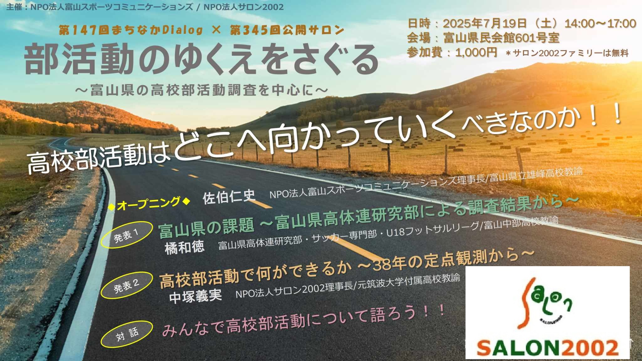 このたび、NPO富山スポーツコミュニケーションズとNPOサロン2002の共催で、富山県の高校部活動を中心に「部活動のゆくえをさぐる」場を設けました。高校部活動の担い手を対象とする調査研究報告や、部活動改革の事例紹介などを通して、「何ができるか」を参加者全員で意見交換したいと思います。